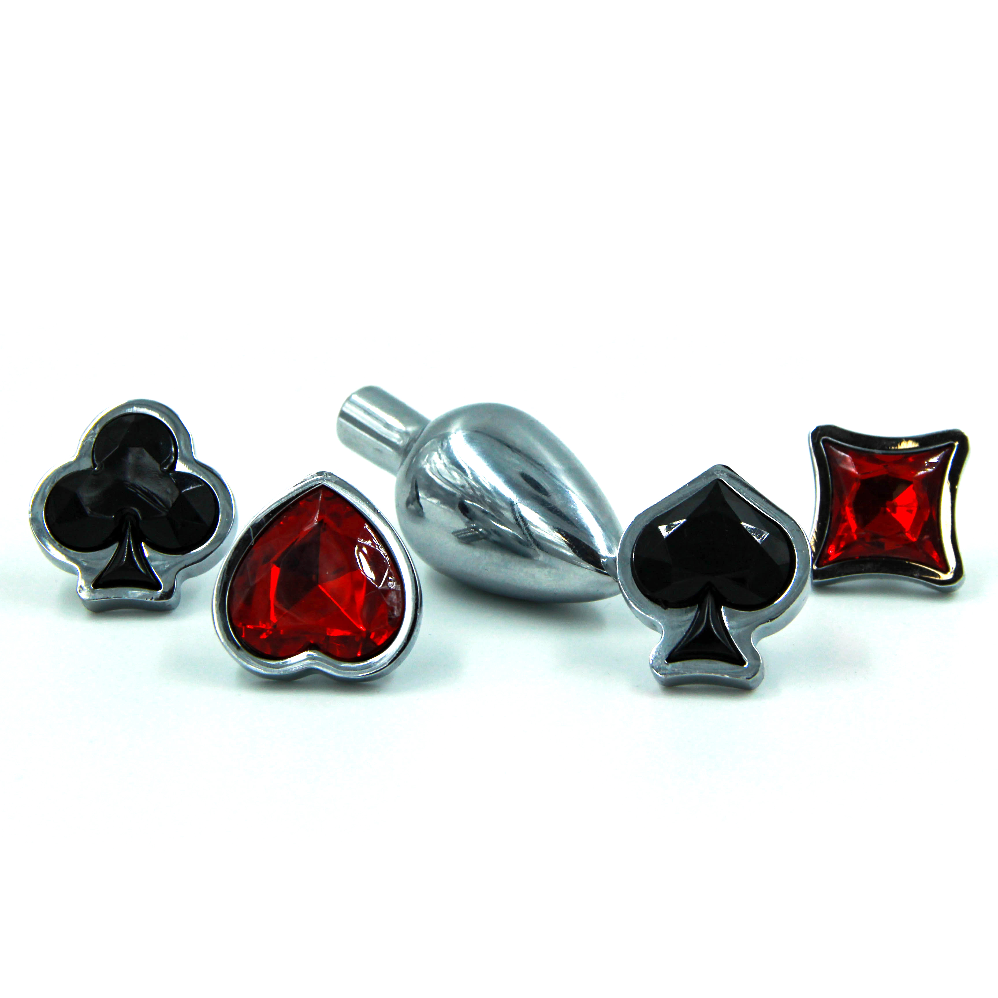 Анальная пробка с набором кристаллов (стразов) – это декоративное украшение, имеющее проникающую анальную часть и четыре имитации драгоценных камней в виде карточных мастей. Идеально подходит для украшения тела, сужения влагалища, подготовки к анальному сексу.Литая анальная пробка имеет конусообразную форму и гладкую фактуру шлифованного металла. Легкий и прочный алюминиевый сплав гарантирует долговечность и гигиеничность, а также абсолютную безопасность даже при постоянном ношении.