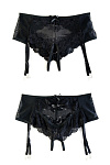 Эротические трусики-пояс из стрейч-сетки, эластичные, со сложными кружевными вставками, с вырезом сзади, без боковых швов, с атласными бантиками. Пажи съемные. Допускается замена кружева на аналогичное.