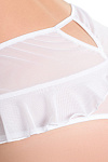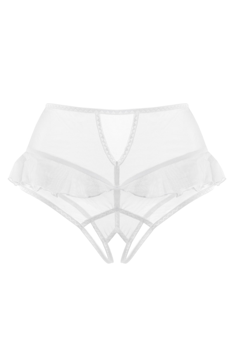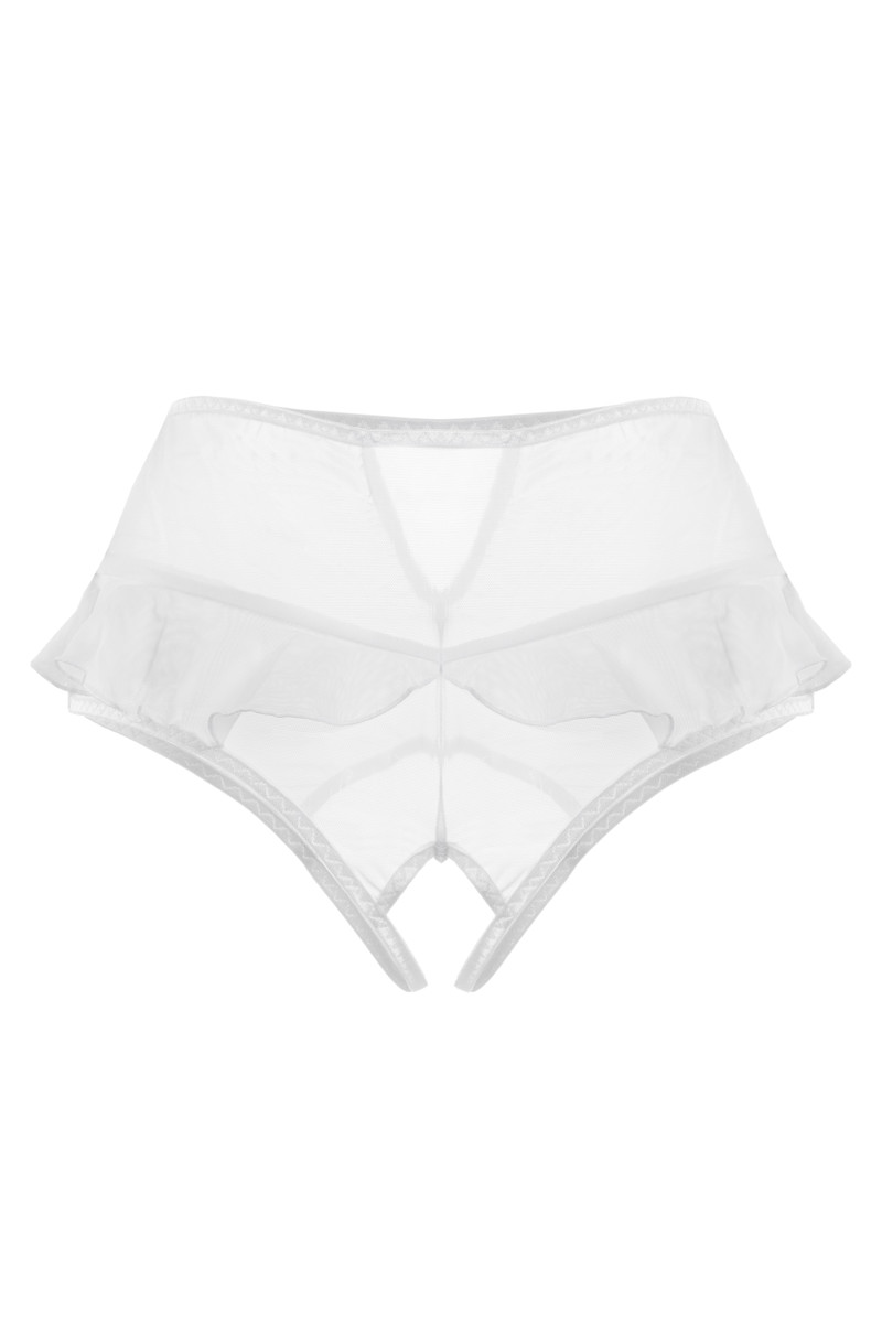 Эластичная сетка изящно подчеркивает линию бедер, а игривые воланы обезоруживают своей невинностью. Высокая посадка эффектно выделяет талию и деликатно скрывает мелкие недостатки фигуры. Пикантный вырез сзади подстегивает мужскую фантазию, а доступ к интимной зоне позволяет наслаждаться игрой, не снимая трусики.