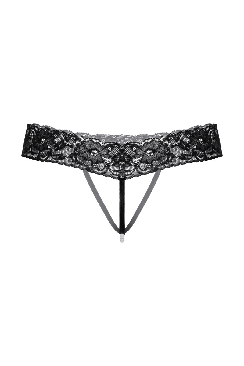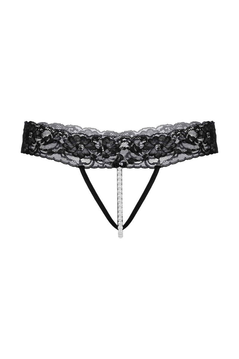 Кружевные стринги с открытым доступом. Спереди декорированы кокетливым бантиком и нитью "жемчуга". Оригинальная кружевная резинка подчеркивает линию бедер.