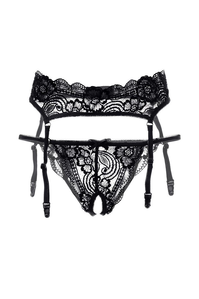 Эротический комплект: пояс для чулок и трусики кружевные, эластичные. Трусики с атласными бантиками. Пояс с ажурным верхним краем, на регулируемой застежке. Допускается замена кружева на аналогичное.
