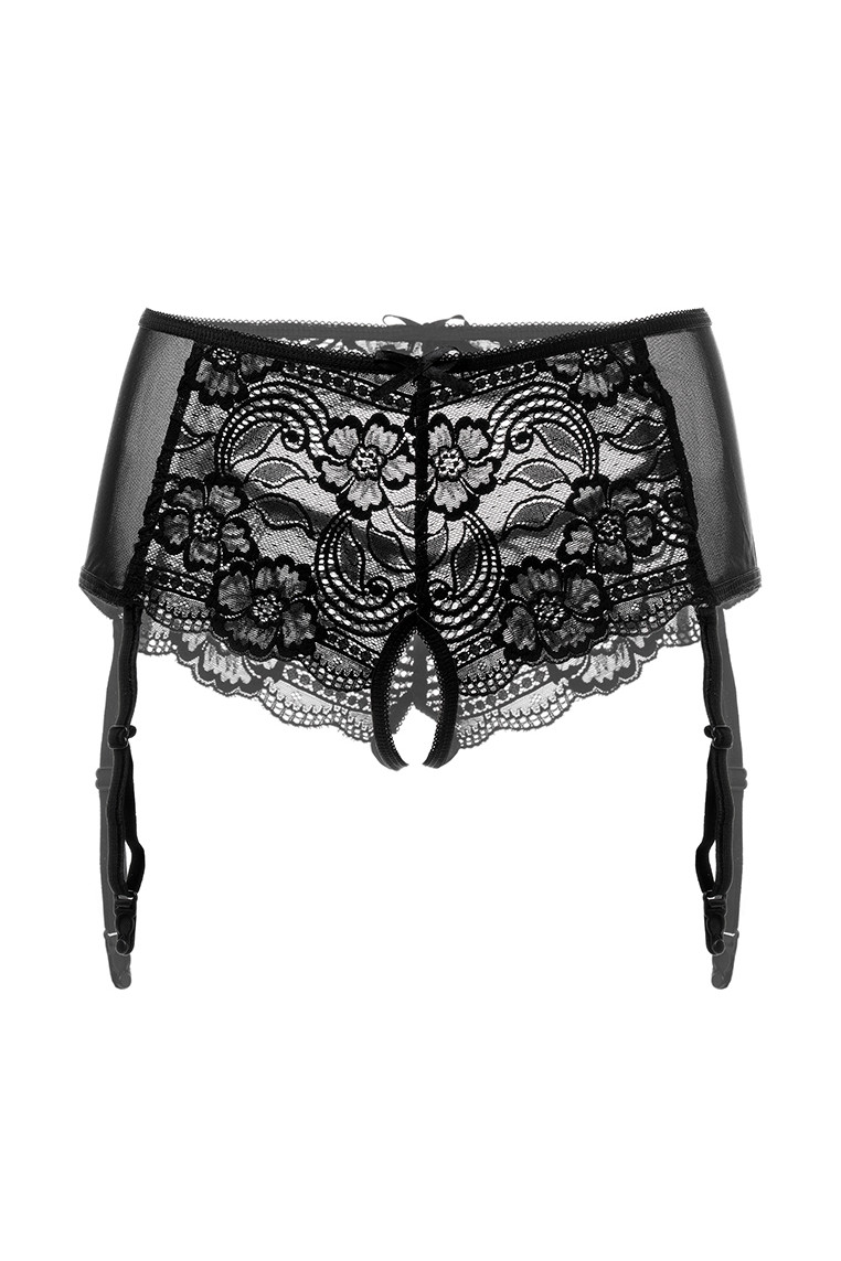 Эротические трусики-пояс из стрейч-сетки, эластичные, со сложными кружевными вставками, с вырезом сзади, без боковых швов, с атласными бантиками. Пажи съемные. Допускается замена кружева на аналогичное.