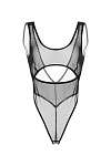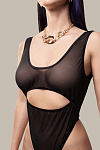 Эффектный вырез под грудью открывает чувствительную зону тела. Аккуратные вытачки и швы и создают силуэтную посадку. Дизайн боди визуально вытягивает ноги. Глубокий вырез сзади, тонкая перемычка между абсолютно открытыми ягодицами и эротический доступ подчеркивают чувственность образа.