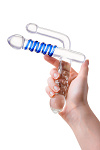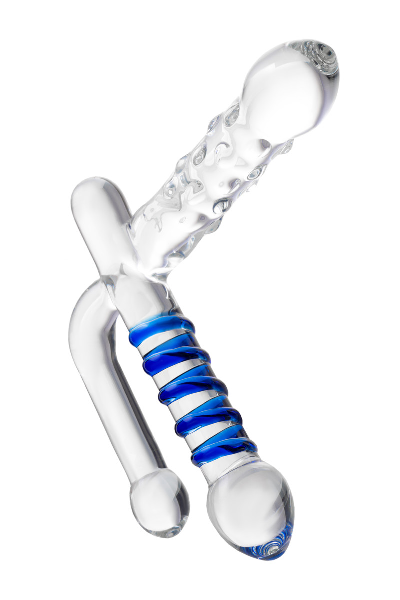 Эта стеклянная игрушка с тремя стимуляторами — идеальный подарок для тех, кто желает наслаждаться интимной жизнью по полной программе. Ведь любая из сторон предназначена для ошеломляющего удовольствия. Итак, у данной секс-игрушки есть вагинальный массажёр с синей спиралью и крупной головкой. Есть параллельный ему гладкий анальный стимулятор. И есть дополнительный вагинальный, который может использоваться не только для стимуляции, но и в качестве ручки для удобного управления приспособлением. Такой интересный аксессуар, безусловно, помогает внести в сексуальную жизнь разнообразие. Вагинальная стимуляция для обеих партнёрш, двойное анально-вагинальное проникновение, а также температурные игры (игрушку можно нагревать или охлаждать) — этот тройной фаллос умеет всё!
