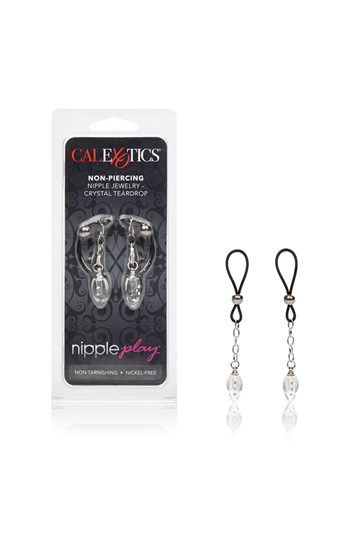Non-Piercing Nipple Jewelry Crystal Teardrop - зажимы на соски в виде лассо, регулируемые с помощью передвижной бусины и кристаллами-листиками, инкрустированными стразами. Петли изготовлены из мягкого, гибкого силикона, регулирующие бусины и цепочки из несодержащего никеля железа, а кристаллы из силики (диоксида кремния).Применение