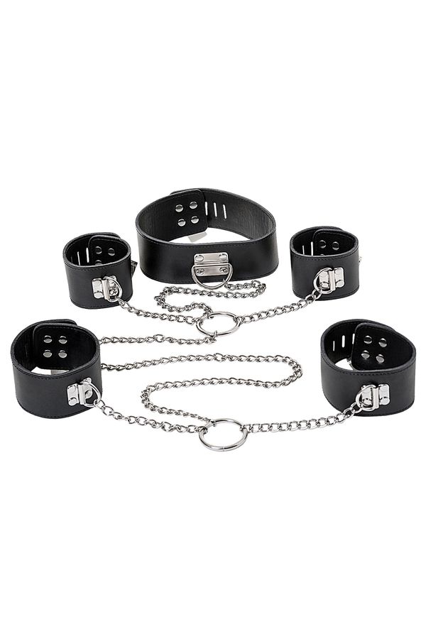 ля любителей тотального ограничения каких-либо движений придуман данный бондажный комплект. Металл, кожа и фиксация сразу трёх основных точек — шеи, рук и ног. Соединена конструкция 70-сантиметровой цепочкой, которая не позволит выпрямиться в полный рост. Расстояние между манжетами наручников и оков — 25 см. В этом комплекте продумано всё до мелочей: стиль, безопасность и Контроль с большой буквы.