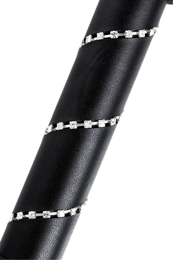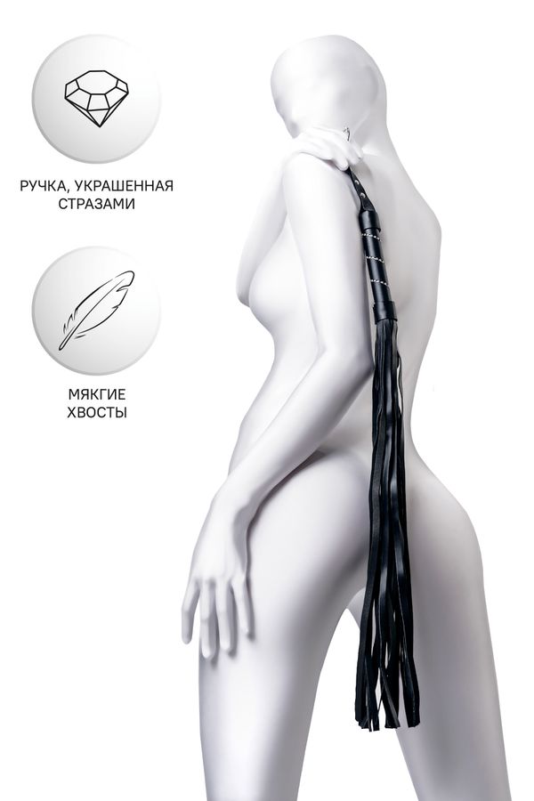 Оптимальный размер, эстетика и функционал – далеко не все достоинства этого изящного девайса. Ручка из черной PU кожи украшена стразами, удобно лежит в руке. Гладкие хвосты рабочей части плети выполнены из мягкой черной PU кожи. Петля служит для более удобного захвата.
