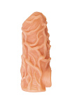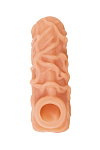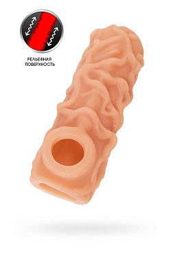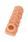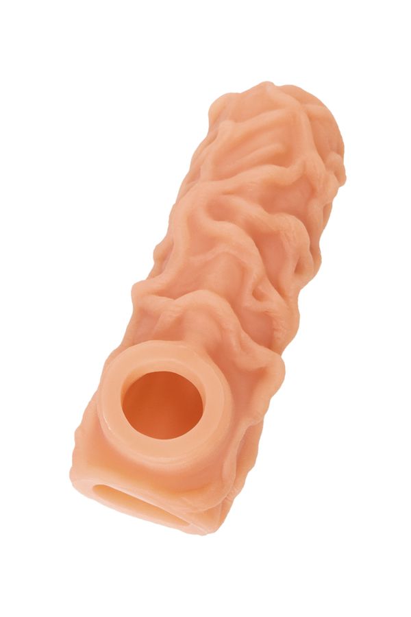 Насадка имеет форму “рукав”, плотно прилегает к пенису, создавая дополнительную толщину и оставляя головку открытой. Это позволяет сохранить чувствительность головки, задерживая эякуляцию. В основании есть отверстие для мошонки, с помощью которого вы надежно зафиксируете насадку на пенисе, не ограничиваясь в активных движениях. Насадка, за счет плотного облегания мошонки и головки, усиливает эрекцию.