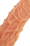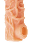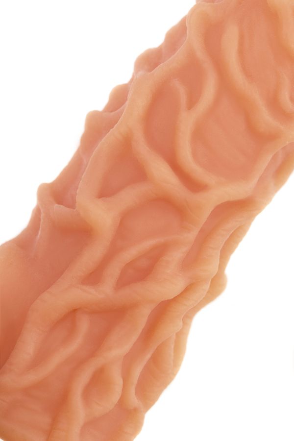 Ярко выраженный рельеф в виде многочисленных выпуклых вен по всему стволу насадки очень хорошо стимулирует зону G, вход во влагалище и настойчиво ласкает чувствительные зоны. Вариативность стимуляции регулируется активным темпом движения вперед-назад и изменением угла проникновения. Дополнительный объем дарит то самое чувство наполненности, увеличивая поток возбуждения. Мужчина тоже будет ощущать стимуляцию за счет давления стенок влагалища на пенис.