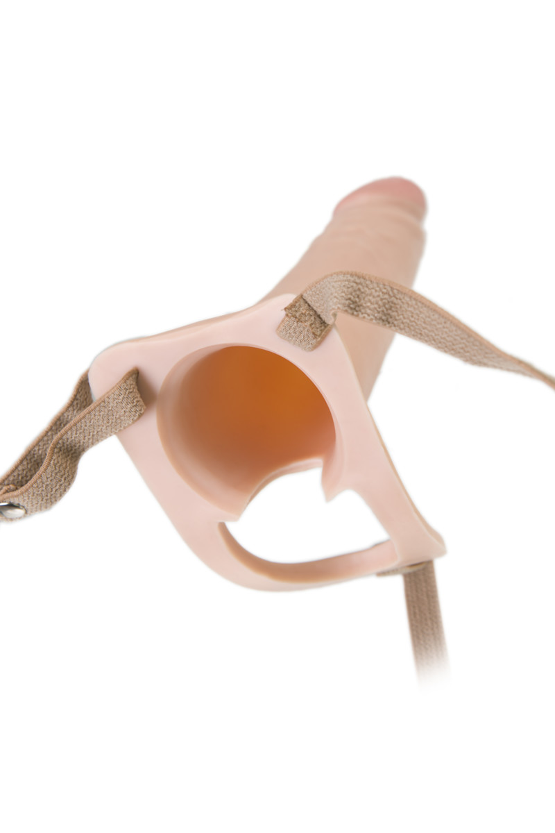 Фаллопротез имеет три точки фиксации на бедрах эластичными регулируемыми резинками, подходит на любую фигуру. Дополнительно насадка комфортно фиксируется вокруг яичек полимерной петелей в основании протеза.