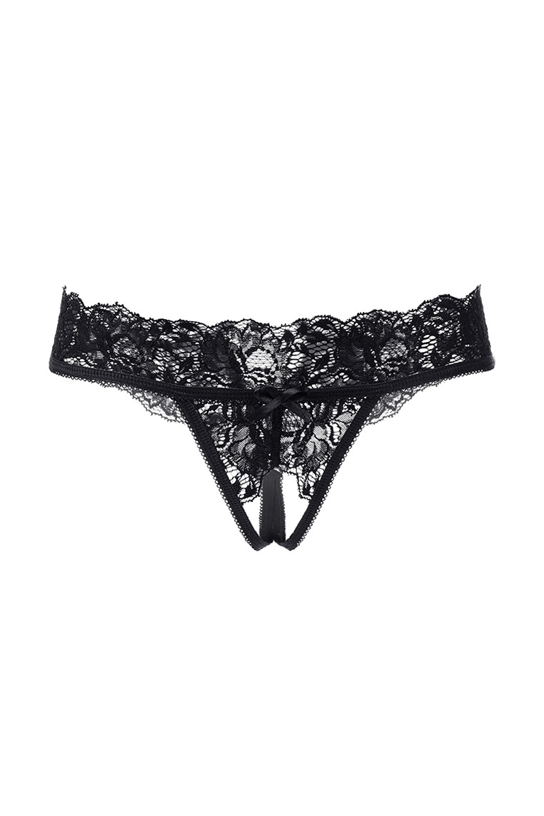 Эротические трусики кружевные, эластичные. Спереди атласный бантик. Сзади декоративный вырез регулируется бантом. Свободный кружевной край сзади и на линии талии. Допускается замена кружева на аналогичное.