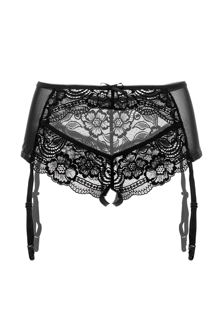 Эротические трусики-пояс из стрейч-сетки, эластичные, со сложными кружевными вставками, с вырезом сзади, без боковых швов, с атласными бантиками. Пажи съемные. Допускается замена кружева на аналогичное.