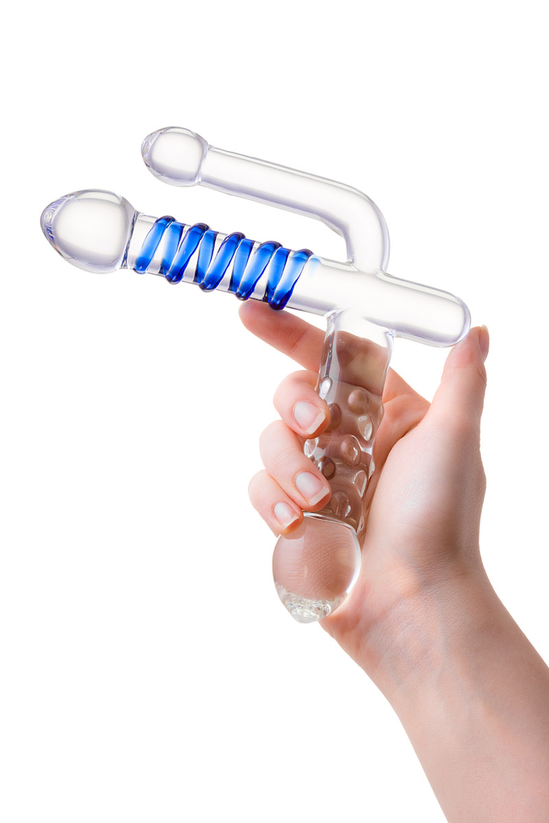 Эта стеклянная игрушка с тремя стимуляторами — идеальный подарок для тех, кто желает наслаждаться интимной жизнью по полной программе. Ведь любая из сторон предназначена для ошеломляющего удовольствия. Итак, у данной секс-игрушки есть вагинальный массажёр с синей спиралью и крупной головкой. Есть параллельный ему гладкий анальный стимулятор. И есть дополнительный вагинальный, который может использоваться не только для стимуляции, но и в качестве ручки для удобного управления приспособлением. Такой интересный аксессуар, безусловно, помогает внести в сексуальную жизнь разнообразие. Вагинальная стимуляция для обеих партнёрш, двойное анально-вагинальное проникновение, а также температурные игры (игрушку можно нагревать или охлаждать) — этот тройной фаллос умеет всё!